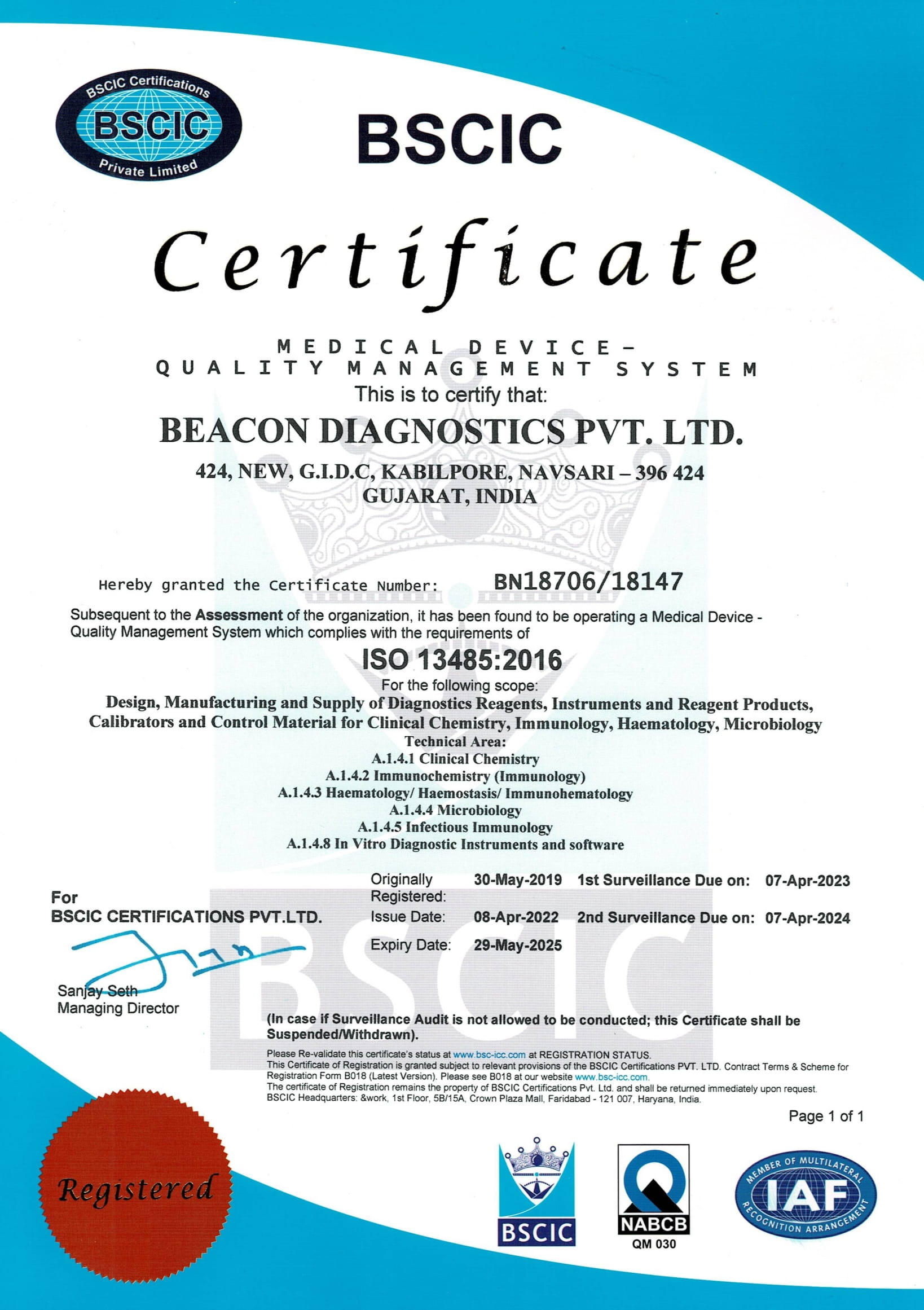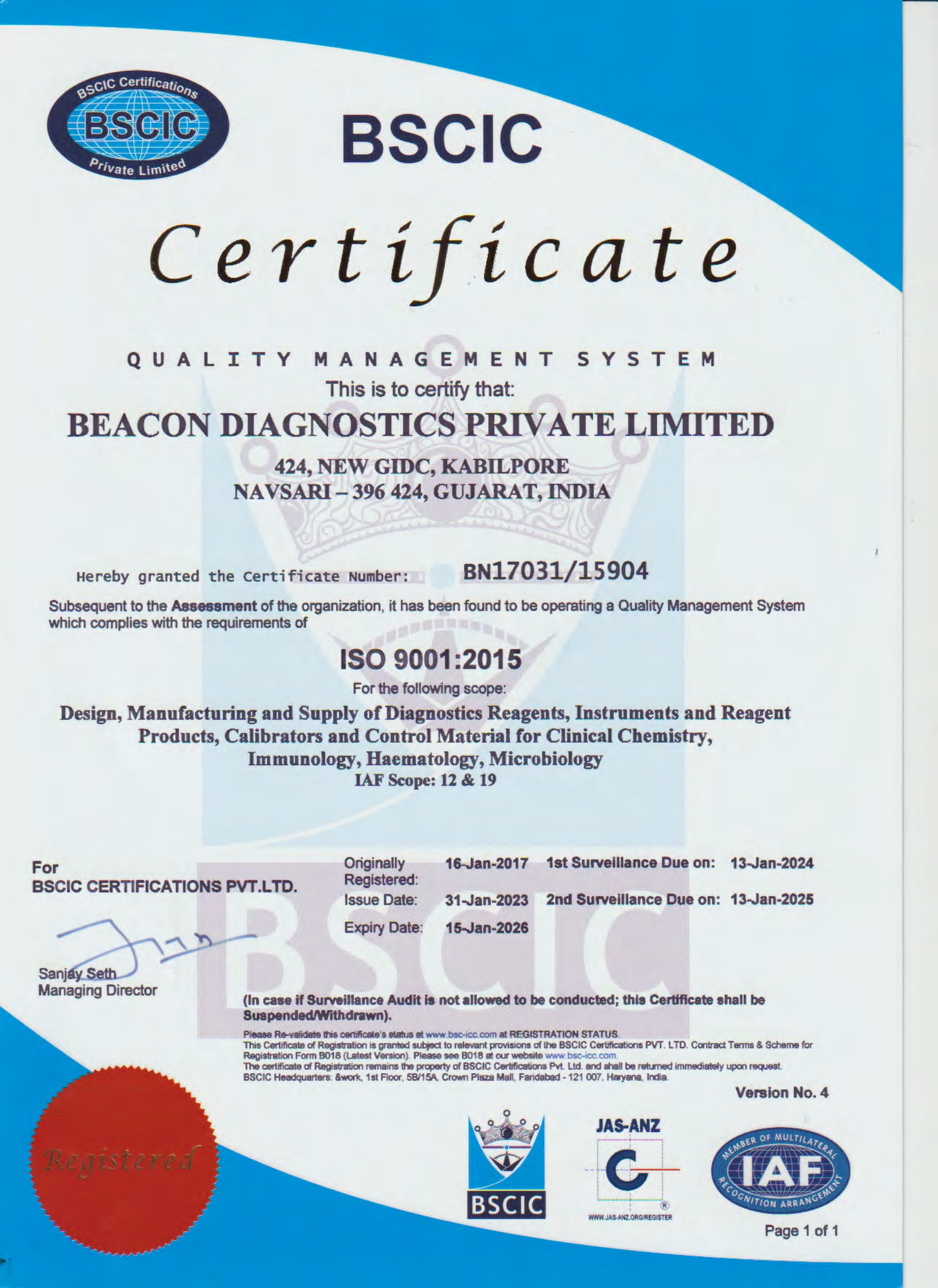 Established in 1990, Beacon Diagnostics Pvt. Ltd. is a prominent manufacturer of reagents and instruments, serving the diagnostics industry with distinction for over 33 years. Based in Navsari, Gujarat, India, Beacon Diagnostics has earned a stellar reputation for its commitment to quality, innovation, and customer satisfaction. Beacon Diagnostics Pvt. Ltd. is an ISO 9001:2015, ISO 13485:2016 certified, and ZED Gold certified company with its manufacturing facility and corporate office located in Navsari, Gujarat. The company extends its reach both domestically and internationally, distributing products to more than 90 countries across the globe.